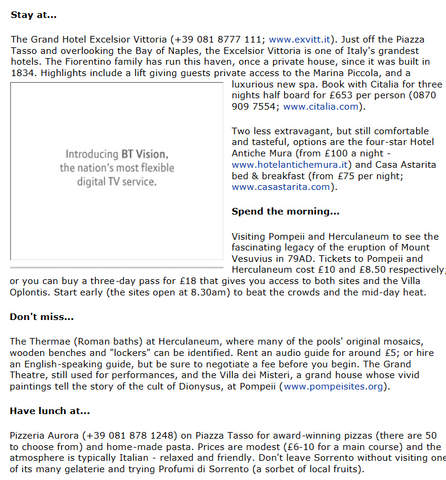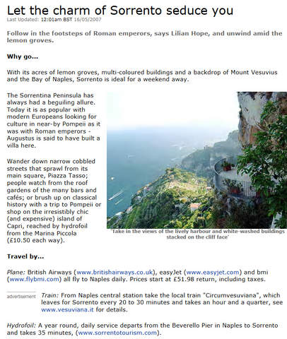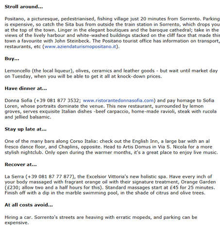 Wander down narrow cobbled streets that sprawl from its main square, Piazza Tasso; people watch from the roof gardens of the many bars and cafés; or brush up on classical history with a trip to Pompeii or shop on the irresistibly chic (and expensive) island of Capri, reached by hydrofoil from the Marina Piccola (£10.50 each way)...